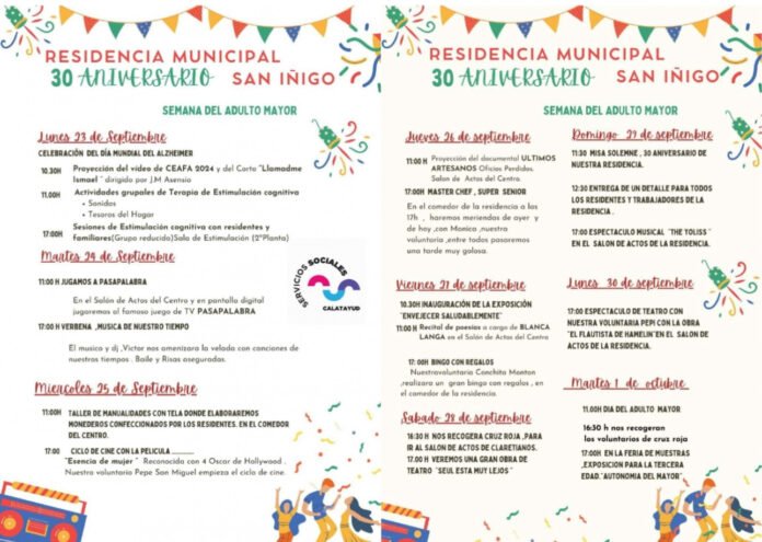 El lunes 30 habrá teatro “El Flautista de Hamelin”, y el martes 1 de octubre, día en que se conmemora la jornada de las personas mayores, los residentes participarán en la exposición “Autonomía del Mayor” en el Recinto Ferial bilbilitano.