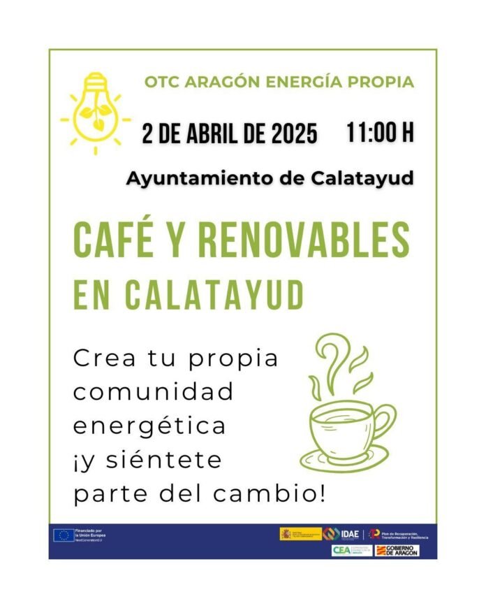 Calatayud será el escenario del próximo encuentro informativo “Café y Renovables”, organizado por la Oficina de Transformación Comunitaria (OTC) Aragón Energía Propia, del Gobierno de Aragón. El evento se celebrará el miércoles 2 de abril a las 11:00 horas en el Salón de Actos del Ayuntamiento de Calatayud (Plaza Costa, nº 14), y tiene como objetivo acercar a la ciudadanía y a la propia Corporación municipal las claves para crear una comunidad energética.