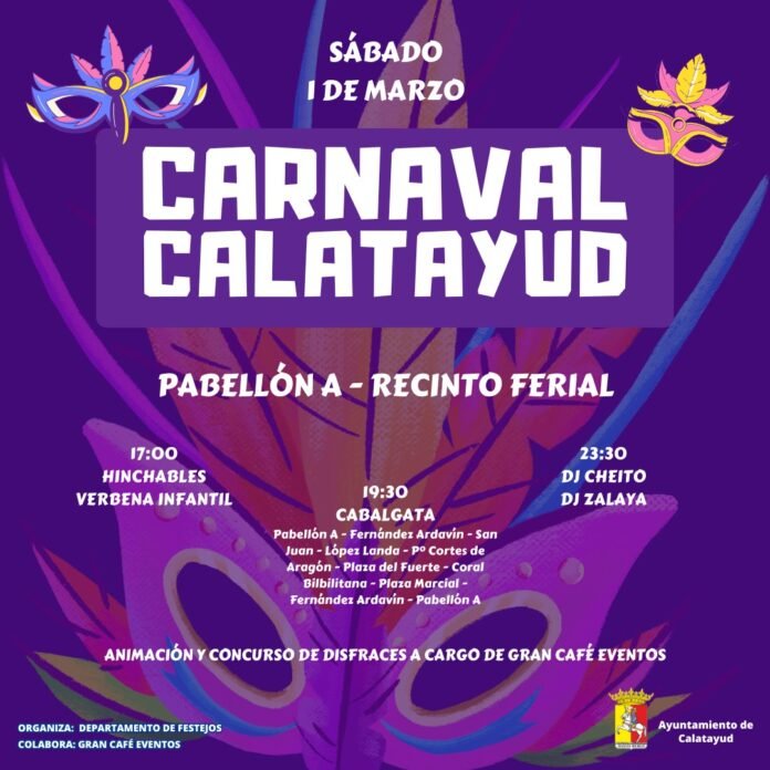 El departamento de Festejos del Ayuntamiento de Calatayud ha anunciado las actividades para la celebración este mismo sábado 1 de marzo del carnaval. El Recinto Ferial, en su pabellón A, será el espacio donde los más pequeños se diviertan con sus disfraces, con hinchables y música desde las 17.00 horas. A partir de las 19.30h, desde allí partirá la cabalgata.