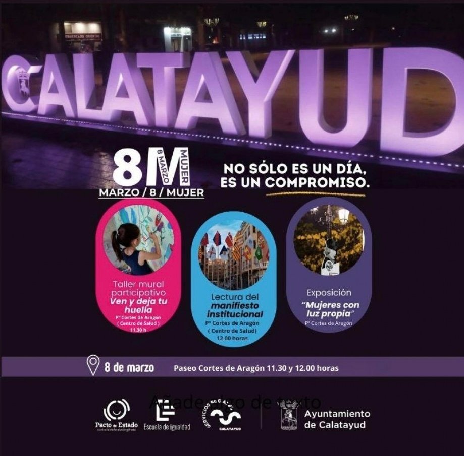 El Centro de Servicios Sociales del Ayuntamiento de Calatayud ha emitido un comunicado en el que invita a la ciudadanía a sumarse a las actividades que se organizan en la ciudad con motivo del Día Internacional de la Mujer, que tendrá lugar este mismo domingo 8 de marzo.