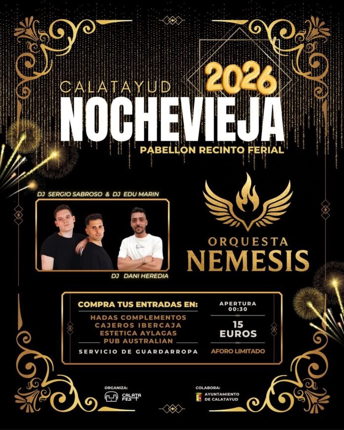 Calatayud se prepara para una celebración de Fin de Año sin precedentes, gracias a la organización de CalataFest en colaboración con el Ayuntamiento bilbilitano. La «Nochevieja 2026» tendrá lugar en el Pabellón Recinto Ferial y promete una noche «diferente, potente y totalmente inmersiva».
