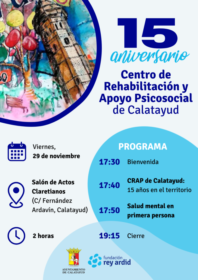 El Centro de Rehabilitación y Apoyo Psicosocial de la Fundación Rey Ardid de Calatayud celebra quince años en la ciudad bilbilitana. El próximo 29 de noviembre, expertos en primera persona realizarán un coloquio en el salón de actos del edificio de Claretianos con entrada gratuita pero para el que habrá que inscribirse previamente.