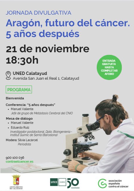 La Asociación Española Contra el Cáncer (AECC) organiza una jornada divulgativa gratuita bajo el título “Aragón, futuro del cáncer. 5 años después”, que se celebrará el próximo 21 de noviembre a las 18:30 horas en la UNED de Calatayud, ubicada en la Avenida San Juan el Real, 1. El evento, con entrada libre hasta completar aforo, busca reflexionar sobre los avances en la investigación oncológica en la región aragonesa cinco años después de hitos previos en este ámbito.