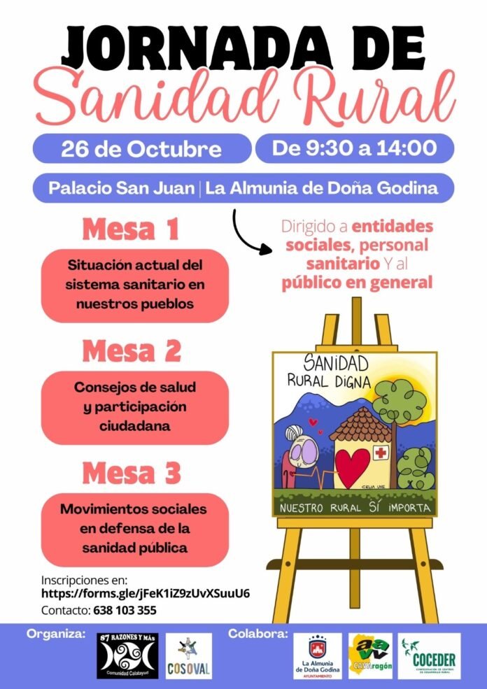 La Federación 87 Razones y Más y el Colectivo COSOVAL, entidades de las Comarcas de la Comunidad de Calatayud y de Valdejalón que reúnen a más de 50 asociaciones radicadas en sus municipios y pedanías, organizan una jornada dirigida al análisis y la reflexión de la Sanidad Rural. Tendrá lugar el próximo 26 de octubre de 9:30h a 14h en el Salón de Actos del Palacio de San Juan, en La Almunia de Doña Godina.