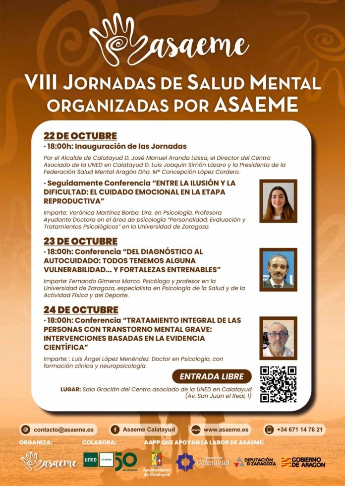 La Asociación Augusta de Enfermos Mentales de Calatayud (ASAEME) celebrará sus VIII Jornadas de Salud Mental los días 22, 23 y 24 de octubre en el Centro Asociado de la UNED en Calatayud (Sala Gración, Av. San Juan el Real, 1). El evento, con entrada libre, contará con la participación de destacados profesionales de la psicología y la salud mental.