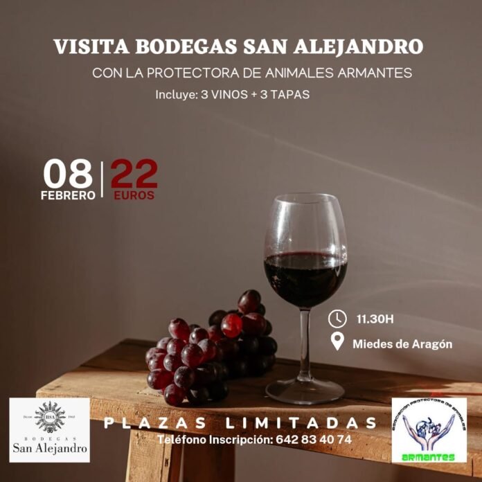El próximo 8 de febrero, los amantes del vino podrán disfrutar de una visita con cata en las Bodegas San Alejandro, en la localidad de Miedes de Aragón. Allí, se podrá disfrutar de las instalaciones con un recorrido guiado donde se conocerá el proceso de elaboración de sus vinos. También, se podrán degustar tres vinos con tres tapas diferentes. Todo por un precio de 22€ por persona.