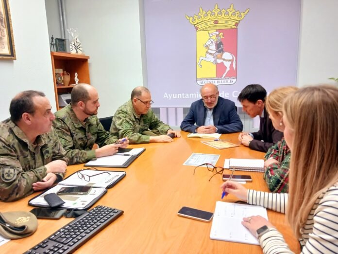 El general director de la Academia de Logística de Calatayud, Ignacio Aldama Orozco y personal de su equipo en el centro de formación castrense, se han reunido con el alcalde José Manuel Aranda para definir cómo será el primer acto de entrega de los diplomas a los “Embajadores de Calatayud”.