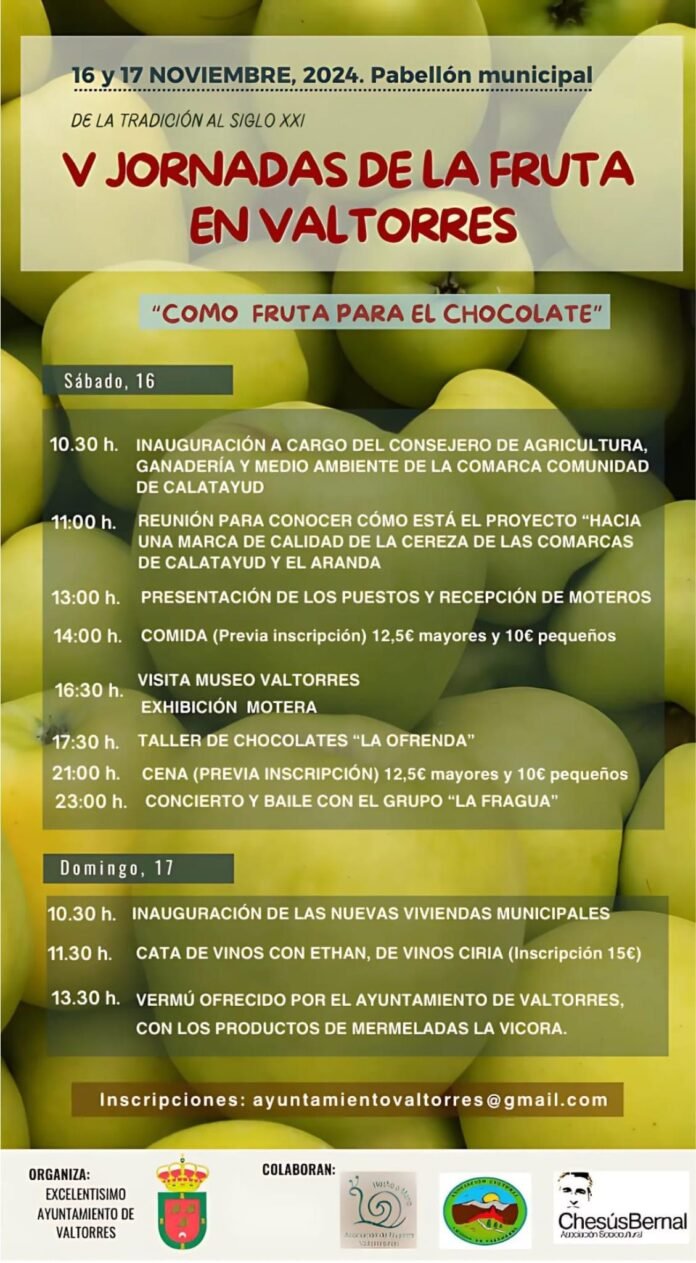 La localidad de Valtorres, en la Comarca Comunidad de Calatayud, se prepara para acoger el próximo fin de semana las quintas jornadas de la fruta. Serán el sábado 16 y el domingo 17 y se desarrollarán en el Pabellón Municipal de esta localidad.