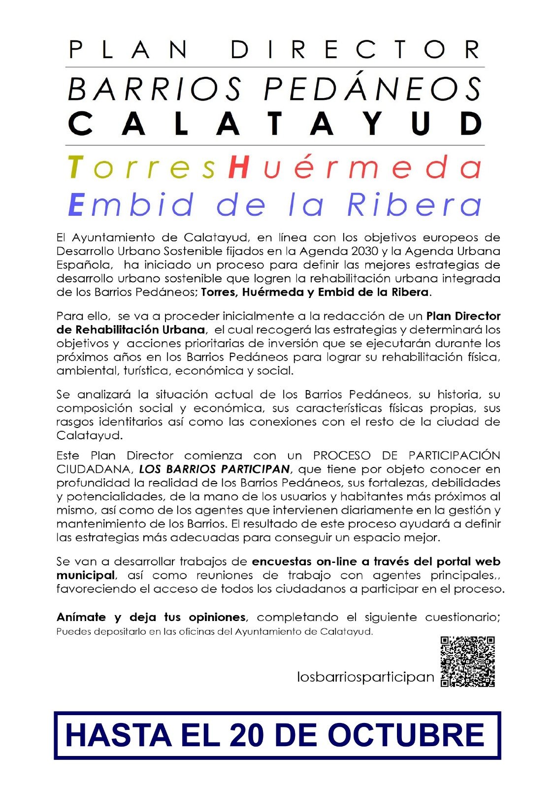 El Ayuntamiento de Calatayud ha abierto un periodo de consultas y de participación ciudadana que servirá para redactar el primer Plan Director de Barrios de Calatayud. Este será un documento de planificación urbana que analizará desde distintos puntos de vista la situación actual de Huérmeda, Embid de la Ribera y Torres. Concretará en que se debe de trabajar e invertir para su desarrollo, mantenimiento y mejora.