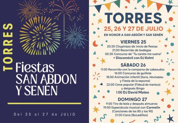 El barrio pedáneo de Torres, en Calatayud, cuenta con un cartel de fiestas muy variado, para que desde los más pequeños a los más mayores disfruten de la celebración en honor a sus patronos. El pistoletazo de salida tendrá lugar este viernes a las 20:30 con el chupinazo.