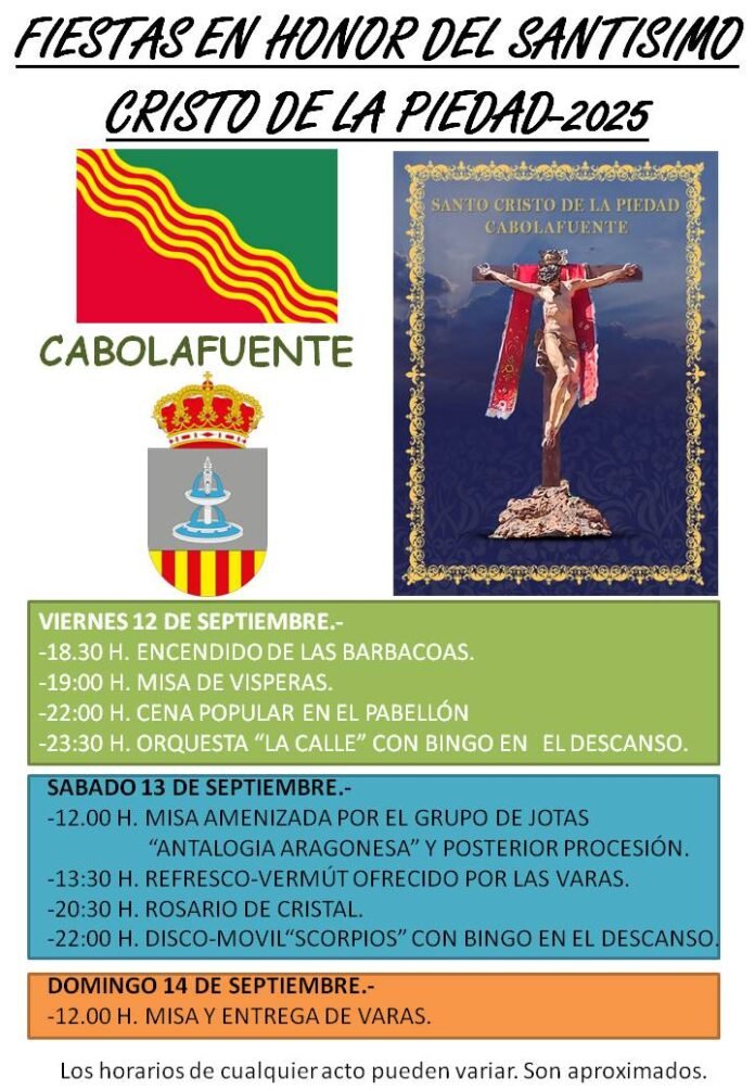 La localidad de Cabolafuente, en la Comarca Comunidad de Calatayud, se prepara para tres días de fervor y tradición con la celebración de sus fiestas en honor al Santísimo Cristo de la Piedad. Los festejos, que se llevarán a cabo del viernes 12 al domingo 14 de septiembre, combinan actos religiosos con actividades festivas para el disfrute de todos los vecinos y visitantes.