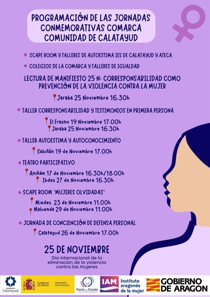 Un acto central de las jornadas será la Lectura del Manifiesto 25N, bajo el lema «Corresponsabilidad como prevención de la violencia contra la mujer», que tendrá lugar en Jaraba el 25 de noviembre a las 16:30h. Además, se han organizado talleres de corresponsabilidad con testimonios en primera persona en El Frasno y Jaraba. El programa se completa con una Jornada de Concienciación de Defensa Personal en Calatayud el 26 de noviembre.