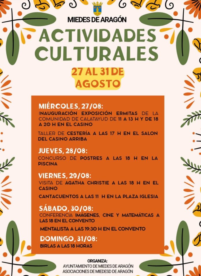 La localidad de Miedes de Aragón, en la Comarca Comunidad de Calatayud, se viste de gala para celebrar una intensa semana de actividades culturales que se desarrollarán del 27 al 31 de agosto. El programa, organizado por el Ayuntamiento de Miedes de Aragón y asociaciones locales, ofrece propuestas variadas para todos los públicos.