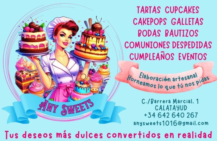 Any Sweets abrirá sus puertas el próximo sábado 22 de febrero de 2024, en la Calle Barrera de Marcial, n°1 de Calatayud. El horario será de martes a domingo, de 9:30h a 13:30h. También se pueden realizar consultas y encargos en el 642 640 267.
