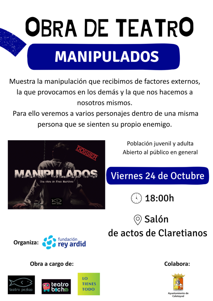 La obra, titulada «Manipulados», es una fábula de humor que profundiza en cómo la manipulación que recibimos de factores externos, la que provocamos en los demás y la que nos hacemos a nosotros mismos afecta a las personas. Para ello, se verán varios personajes dentro de una misma persona que se sienten su propio enemigo. El objetivo es crear un espacio para compartir, aprender y acercarnos, a través del arte, a una realidad que concierne a toda la sociedad.