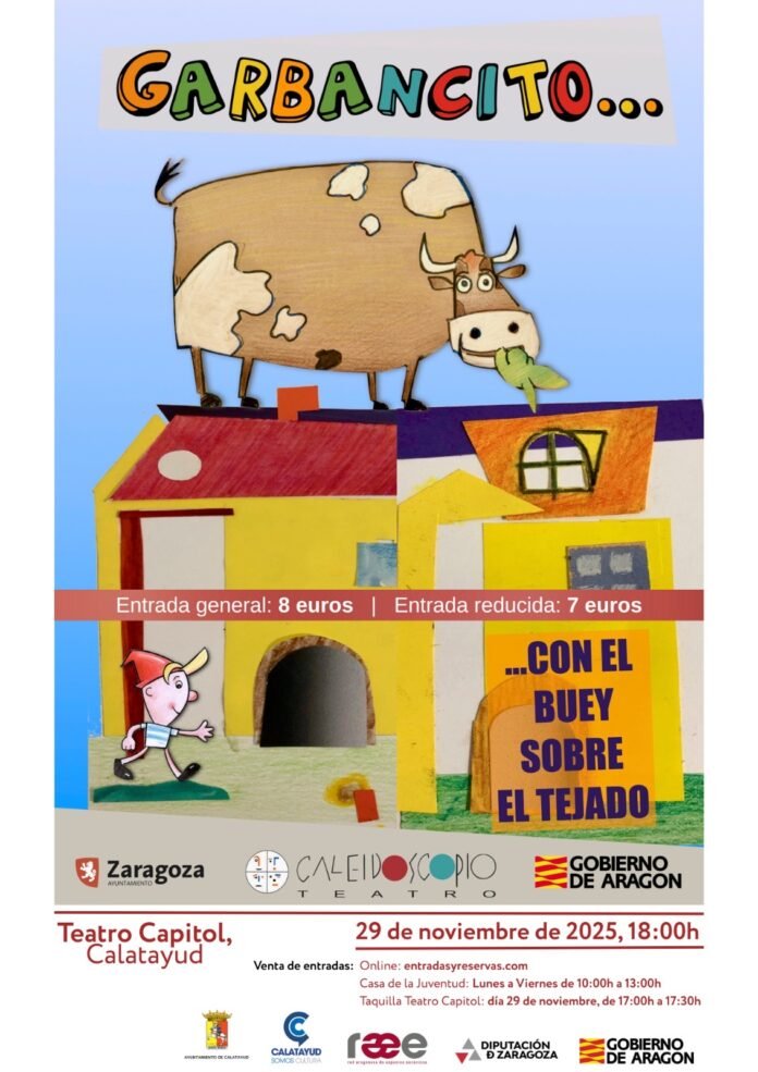 Caleidoscopio Teatro presenta en el Teatro Capitol de Calatayud su nueva producción familiar, «Garbancito… con el buey sobre el tejado», una adaptación mágica y contemporánea del cuento popular que se podrá disfrutar mañana sábado 29 de noviembre de 2025 a las 18:00h.