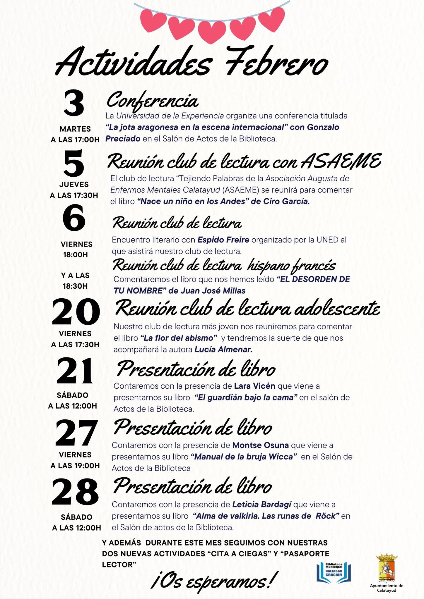 La actividad cultural en la Biblioteca Municipal Baltasar Gracián no da tregua este mes. Tras un arranque de febrero marcado por el éxito de la conferencia de Gonzalo Preciado sobre la jota aragonesa y las primeras tertulias de los clubes de lectura junto a ASAEME y la UNED, la programación encara su segunda quincena con propuestas de gran calado para todas las edades.