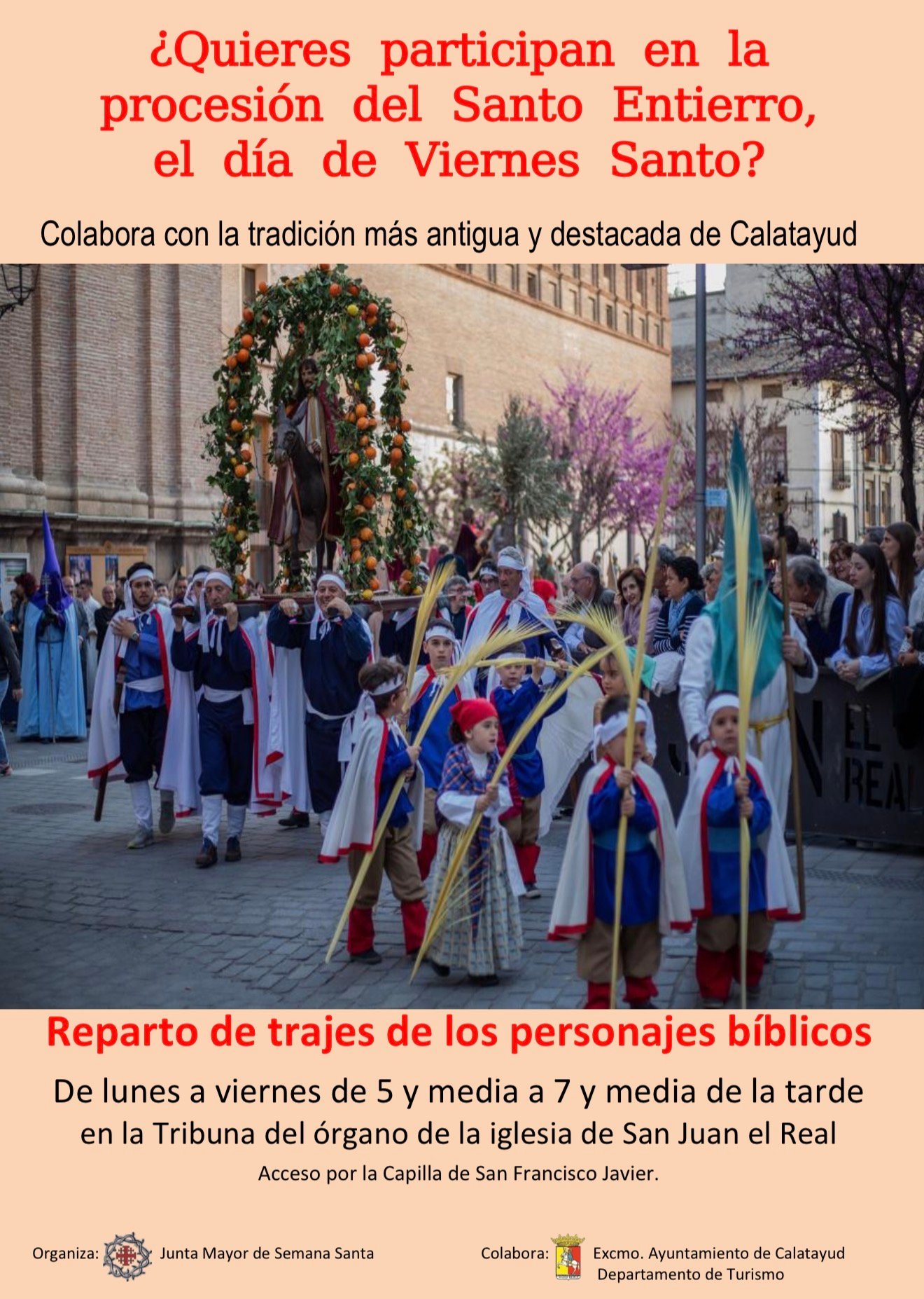 La Junta Mayor de la Semana Santa de Calatayud ya ha comenzado la campaña de recogida de trajes para participar en la Procesión del Santo Entierro que partirá al anochecer del Viernes Santo desde la Parroquia de San Juan el Real de Calatayud. Un año más, se pide colaboración para encarnar a los personajes bíblicos del Antiguo y el Nuevo Testamento y conseguir que la procesión salga al completo.