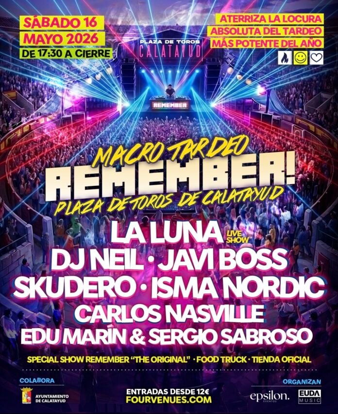 Calatayud se prepara para retroceder en el tiempo y vibrar con los sonidos que marcaron a toda una generación. El próximo 16 de mayo de 2026, la Plaza de Toros de la ciudad se transformará en el epicentro del baile con la celebración del Macro Tardeo Remember, un evento que promete ser la cita más potente del año para los amantes de la música de baile clásica.