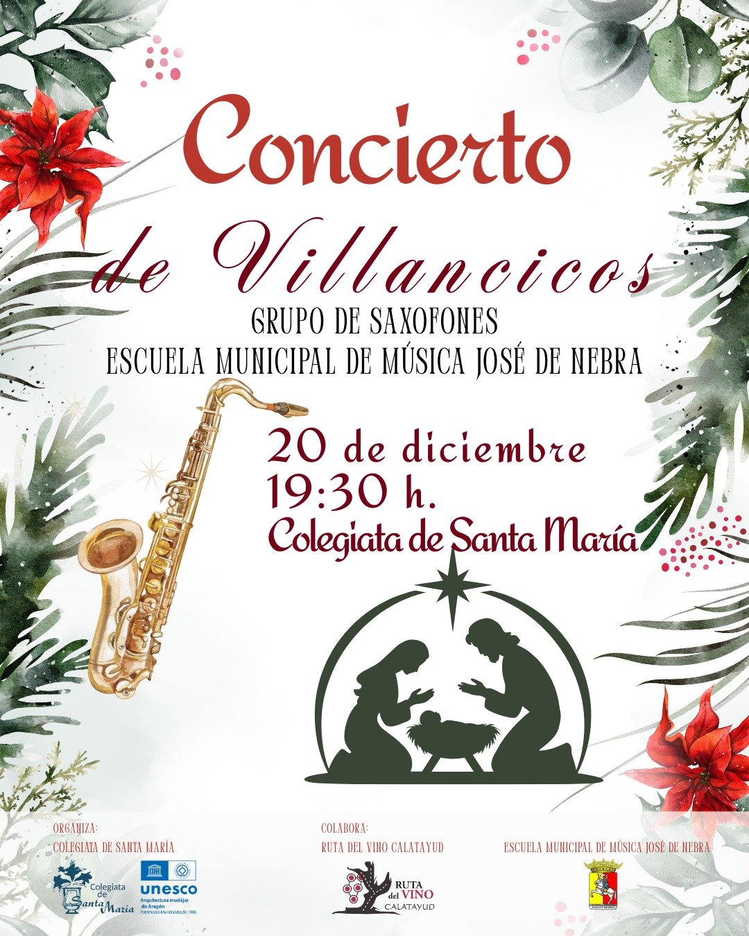 La emblemática Colegiata de Santa María de Calatayud se convertirá esta tarde en el escenario de una velada musical única. El templo, reconocido como Patrimonio Mundial por la UNESCO, acogerá un emotivo concierto de villancicos protagonizado por el Grupo de Saxofones de la Escuela Municipal de Música “José de Nebra”. Esta cita cultural, que comenzará a las 19:30 h, busca unir el talento del alumnado local con la riqueza arquitectónica de la ciudad en una de las celebraciones más esperadas del calendario navideño.