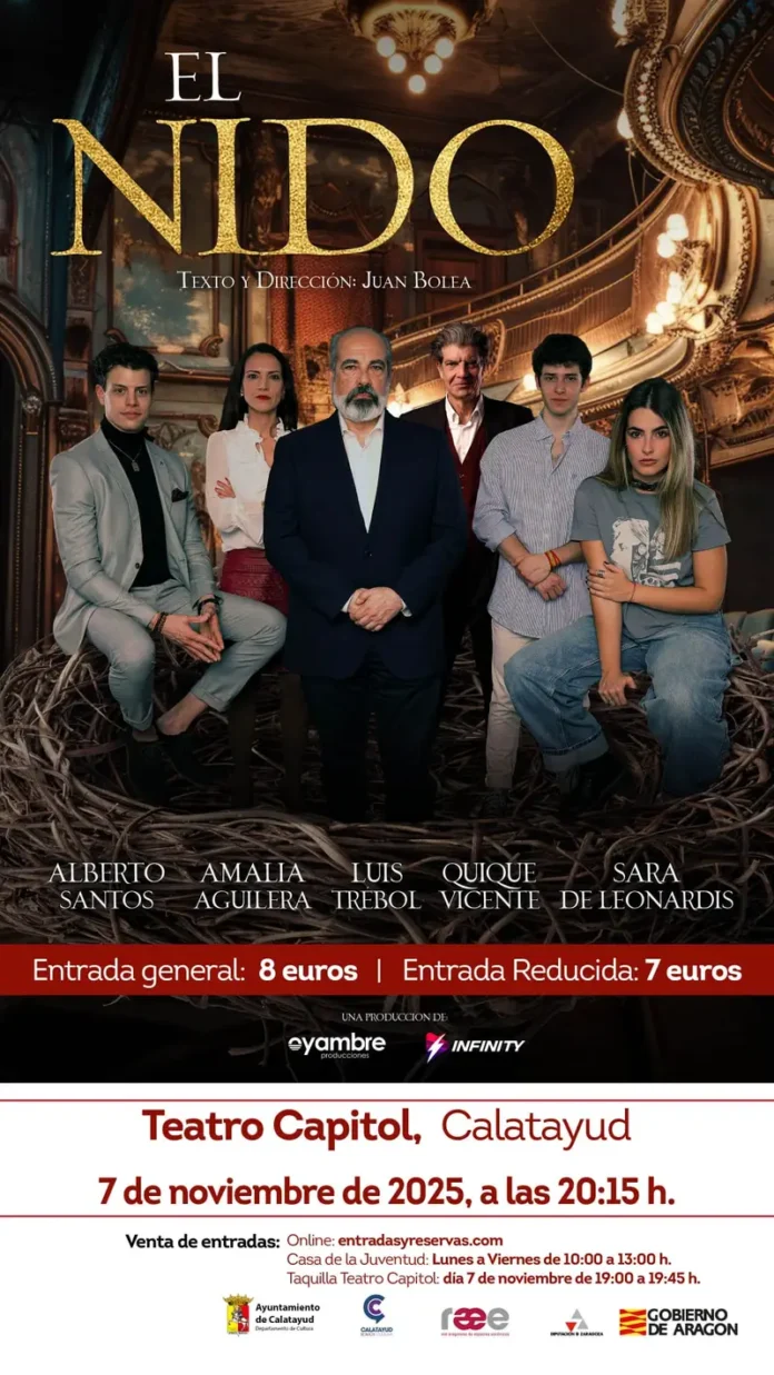 La obra teatral «El Nido,» una moderna tragicomedia que ofrece un retrato actual de la España contemporánea y una inmersión profunda en el seno de una familia, se presentará en el Teatro Capitol de Calatayud este viernes 7 de noviembre a las 20:15h. Escrita y dirigida por Juan Bolea , «El Nido» tiene una duración de 1 hora y 45 minutos y está clasificada para todos los públicos.