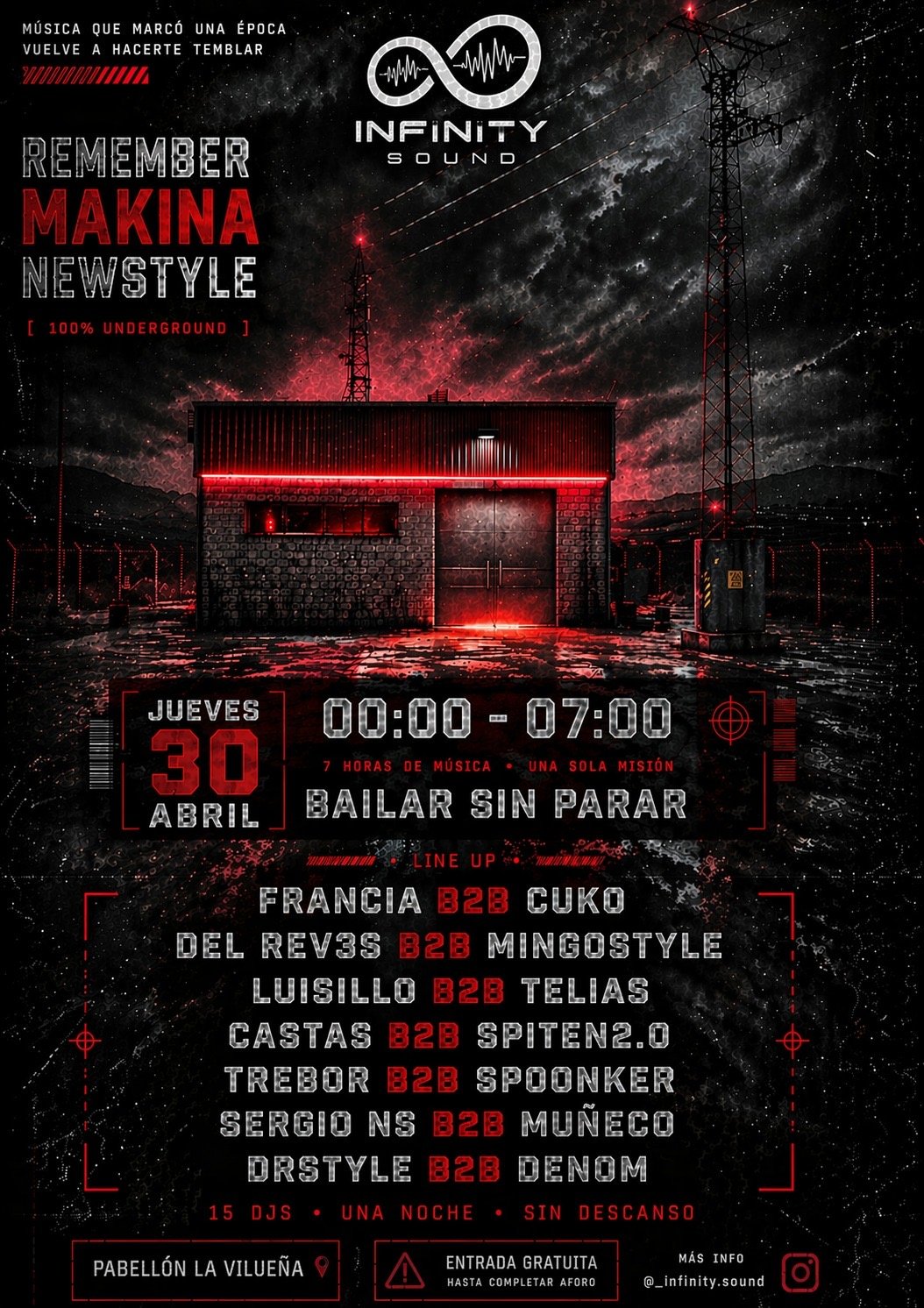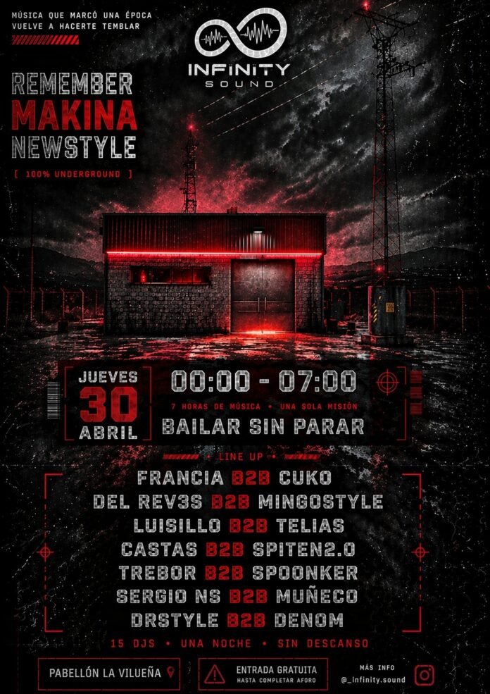 La escena underground tiene una cita marcada en rojo en el calendario. El próximo jueves 30 de abril, la promotora Infinity Sound transformará el Pabellón de La Vilueña en el epicentro del sonido más contundente con su evento «Remember Makina Newstyle». Bajo el lema «Una noche, una misión: bailar sin parar», la organización promete siete horas de música ininterrumpida, desde la medianoche hasta las siete de la mañana, en una jornada diseñada para los nostálgicos y los amantes de los ritmos acelerados.