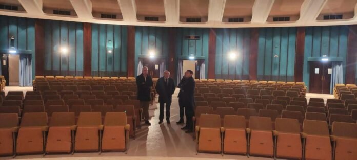 El salón de congresos que en origen también sirvió de cine tiene 628 metros cuadrados, a los que se suman los de accesos y hall, aseos, salas más pequeñas, espacios para instalaciones, y cabina de proyección.