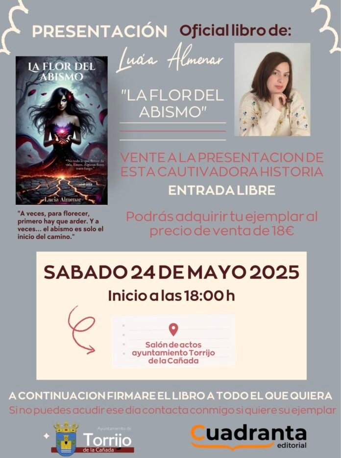 La escritora Lucía Almenar presentará oficialmente su primera novela publicada, «La Flor del Abismo», el próximo sábado 24 de mayo a las 18:00h en el salón de actos del ayuntamiento de Torrijo de la Cañada, municipio de la Comarca Comunidad de Calatayud. La obra, publicada por Cuadranta Editorial, sumerge al lector en un fascinante universo de fantasía oscura que entrelaza magia, dolor y un amor profundo a través de la inolvidable protagonista, Eireen.