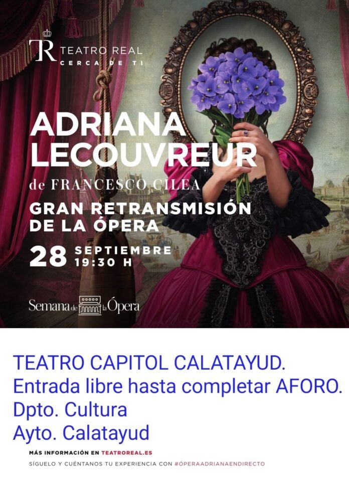 Los bilbilitanos tienen este sábado 28 de septiembre la oportunidad de asistir a la retrasmisión en directo de la ópera “Adriana Lecouvreur”, basada en la vida de esta actriz estrella de la comedia francesa del siglo XVIII y llena de amor, venganza y tragedia.