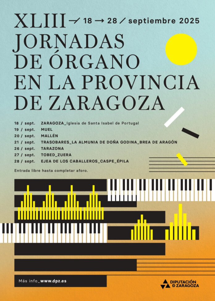 Seis conciertos en Tarazona, Tobed, Zuera, Ejea, Épila y Caspe cerrarán este fin de semana una nueva edición de las Jornadas de Órgano en la Provincia de Zaragoza organizadas un año más por la Diputación de Zaragoza. El ciclo, que comenzó el pasado 18 de septiembre, finalizará mañan domingo, 28 de septiembre. Todos los conciertos son de entrada libre hasta completar el aforo.