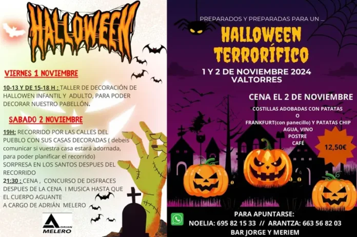 Por su parte, el sábado 2 de noviembre habrá, a partir de las 19h, un recorrido por las calles del pueblo con sus casas decoradas. Desde el Ayuntamiento de Valtorres informan que será necesario comunicar las casas adornadas para planificar el recorrido. Al finalizar, habrá sorpresa en los Santos, tal y como explica el cartel anunciador.