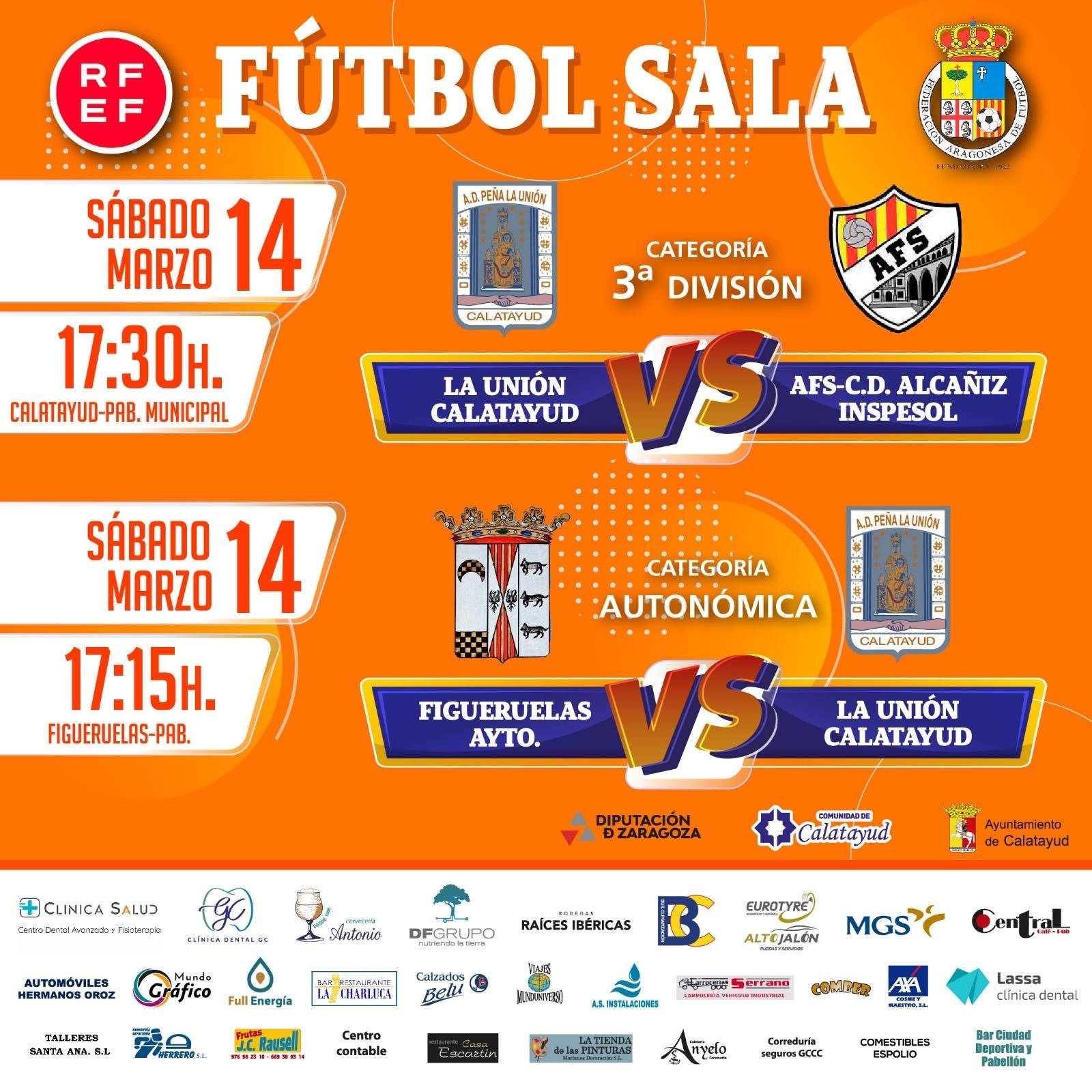 Nueva jornada para los equipos de fútbol sala de la Agrupación Deportiva Peña la Unión de Calatayud. El equipo de Tercera División recibirá al AFS-CD Alcañiz Inspesol el sábado 14 de marzo a las 17:30h en el Pabellón Polideportivo Municipal “Pablo Abián” de Calatayud.