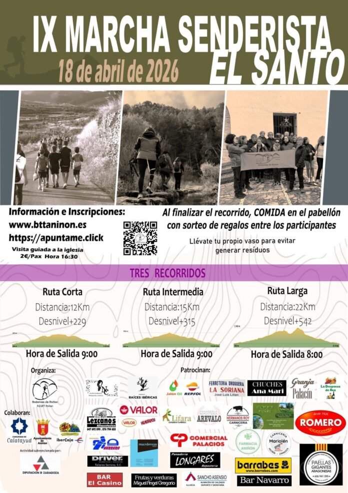 La localidad de Aniñón ya se prepara para recibir a cientos de caminantes el próximo 18 de abril de 2026 con motivo de la IX Marcha Senderista «El Santo». Este evento, que se ha consolidado como una cita ineludible para los amantes del deporte al aire libre en la comarca, ofrece una jornada que combina el desafío físico con la convivencia y el respeto por el medio ambiente.