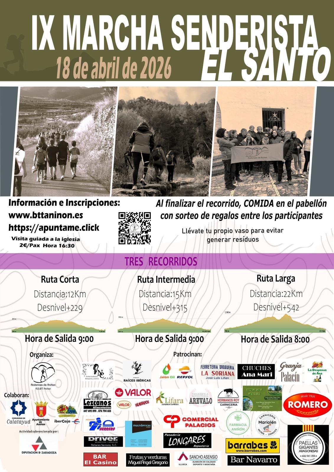 En un firme compromiso con la sostenibilidad, la organización hace un llamamiento especial a los asistentes para que lleven su propio vaso, buscando así reducir al mínimo la generación de residuos plásticos durante el evento. Los interesados en participar pueden formalizar su inscripción a través de los portales web oficiales indicados en el cartel informativo o mediante el código QR habilitado para tal fin. La marcha cuenta con el respaldo del Ayuntamiento de Aniñón, la Diputación de Zaragoza y una amplia red de comercios locales que apuestan por el dinamismo rural y el deporte.