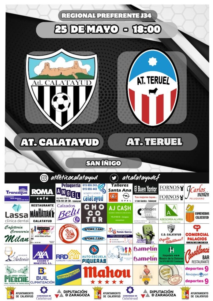 Los bilbilitanos reciben este próximo domingo al Atlético Teruel en la última jornada de liga. Será un encuentro que tendrá lugar en el Municipal “San Iñigo”, en la Ciudad Deportiva de Calatayud, y comenzará a las 18h. Los de Sergio Pérez “Willy”, son terceros clasificados y el de este domingo será el último partido de la temporada. Para finalizar terceros y además, mejores terceros de la Regional Preferente Aragonesa, necesitarán una sola cosa: ganar y conseguir los tres puntos.