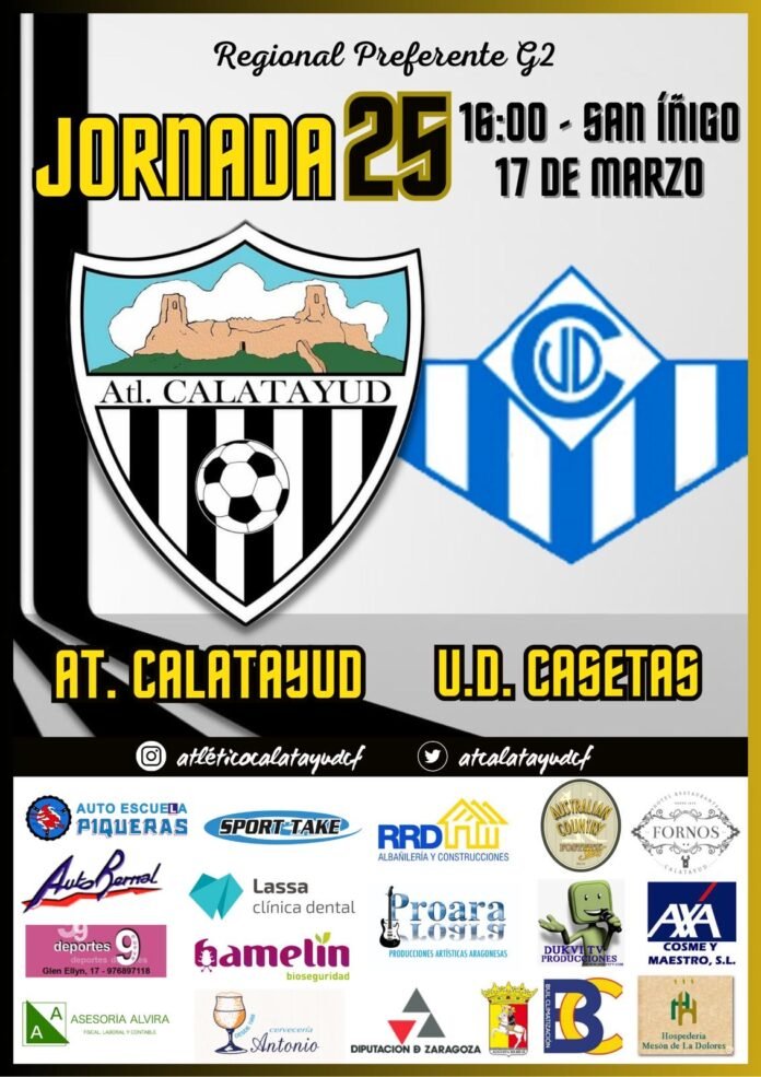 Vigésimo quinta jornada en la Regional Preferente Aragonesa. Hoy, el Atlético Calatayud recibe en casa a la UD Casetas en un importante partido que comenzará a las 16h en el Municipal “San Iñigo” de la Ciudad Deportiva bilbilitana.