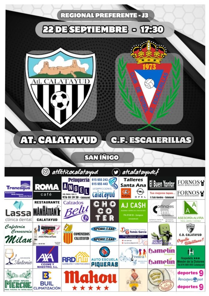 Nueva jornada de liga para el grupo 2 de la Regional Preferente Aragonesa. El Atlético Calatayud se enfrenta mañana, domingo 22 de septiembre, a partir de las 17:30h al Atlético Escalerillas.
