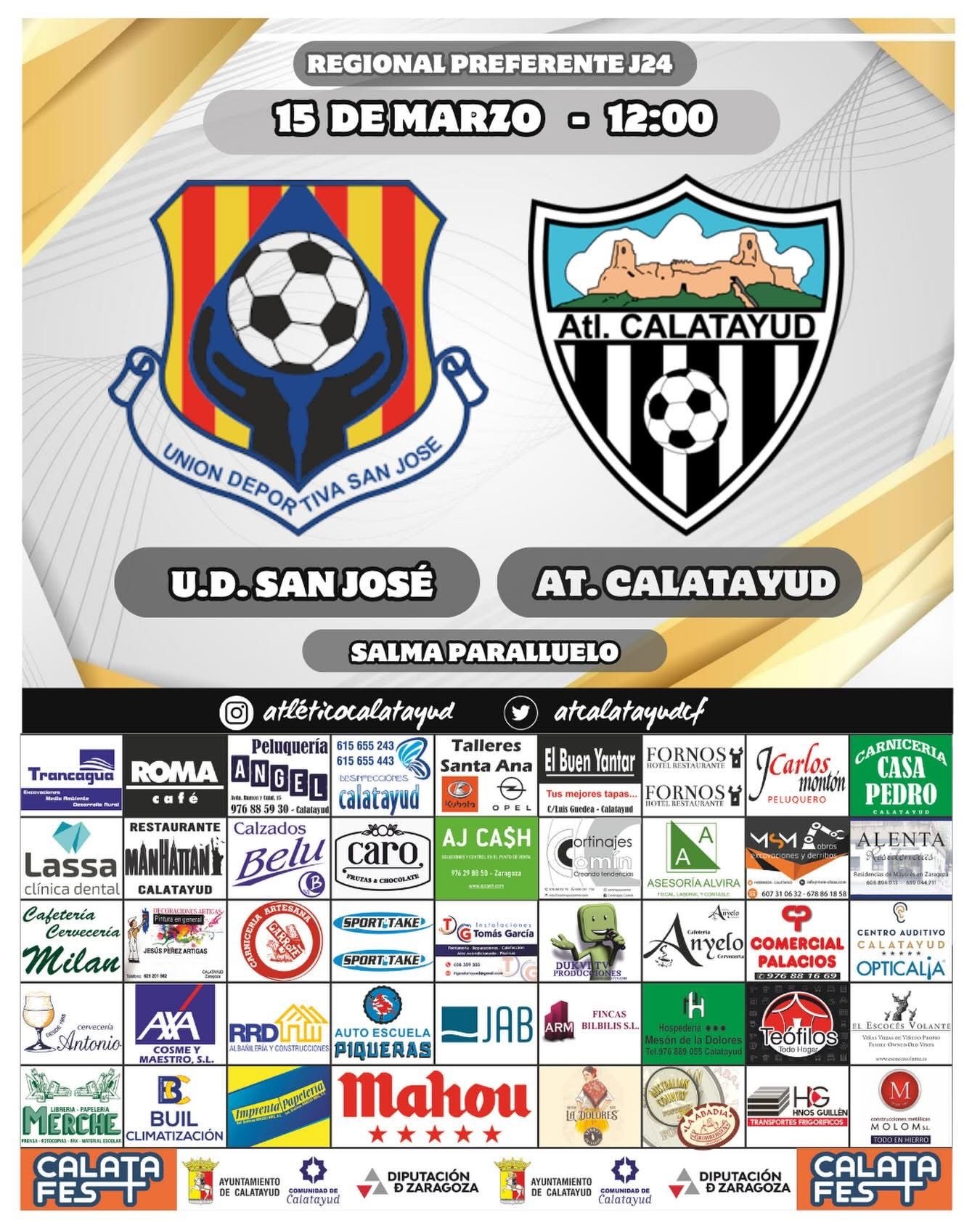 Vigésimo cuarta jornada de liga en el grupo 2 de la Regional Preferente Aragonesa. Este próximo domingo 15 de marzo, el Atlético Calatayud visitará la capital aragonesa para enfrentarse a la UD San José.