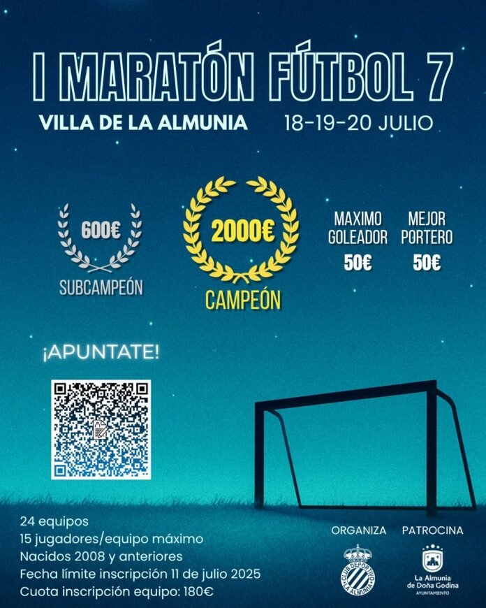 La expectación crece en La Almunia ante la inminente celebración de la 1ª Maratón de Fútbol 7 «Villa de La Almunia», que tendrá lugar los próximos 18, 19 y 20 de julio en el Campo Municipal de Tenerías. El evento promete no solo tres días de fútbol ininterrumpido bajo los focos, sino también sustanciosos premios para los equipos y jugadores más destacados.