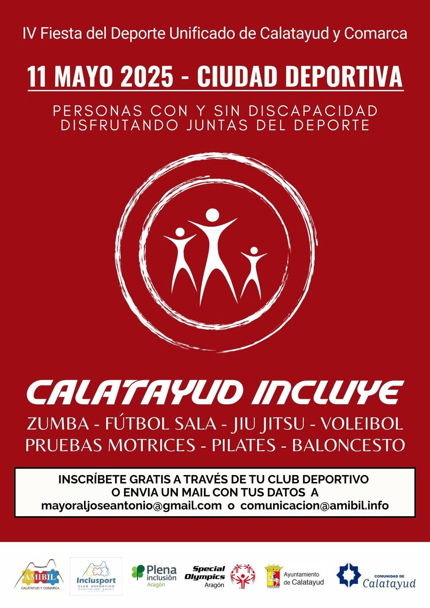 La cuarta edición de Calatayud Incluye, la Fiesta del Deporte Unificado de Calatayud y Comarca, tendrá lugar hoy, domingo 11 de mayo, en la Ciudad Deportiva de Calatayud a partir de las 9:30 horas. Los participantes iniciarán la mañana con un calentamiento conjunto a base de zumba con Sara Germán y después, ya divididos por grupos, recorrerán las 6 estaciones deportivas: fútbol sala, baloncesto, jiu jitsu, pilates, voleibol y pruebas motrices. La clave de Calatayud Incluye, tal y como explican desde AMIBIL, es que los grupos de deportistas son mixtos formados por personas con y sin discapacidad que practican deporte juntas en un ambiente de apoyo mutuo y de inclusión.