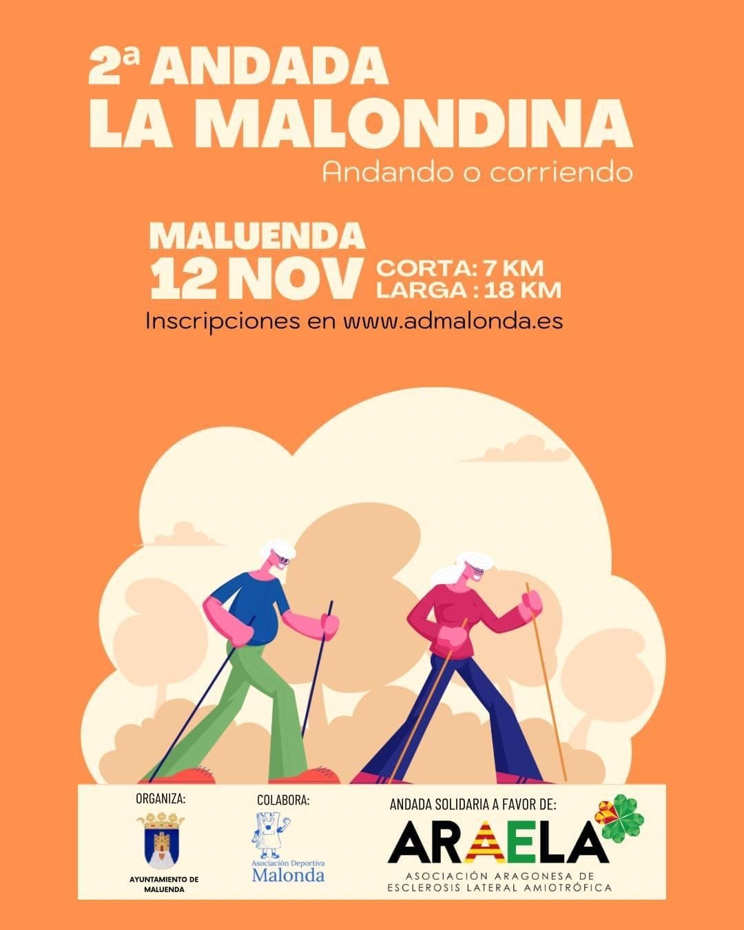 Maluenda se solidarizara con los enfermos de ELA el próximo 12 de noviembre de 2023. Día en que se celebrará la segunda edición de la andada popular “La Malondina”. Una ruta corta de 7km y una larga de 18km que podrá realizarse andando o corriendo.