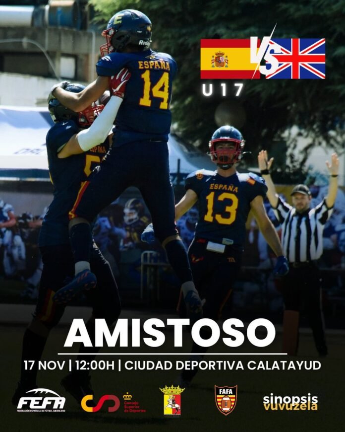 Mañana domingo 17 de noviembre a las 12.00 horas, la Ciudad Deportiva de Calatayud, acoge un amistoso entre las selecciones U17 de España y Gran Bretaña. El choque, organizado por la Federación Española de Fútbol Americano, cuenta con el apoyo del Ayuntamiento de Calatayud, la Federación Aragonesa de Fútbol Americano y el Consejo Superior de Deportes (CSD), y tendrá entrada gratuita. Además, el encuentro se podrá ver en directo a través del canal de YouTube de FEFA gracias a la retransmisión de Sinopsis Vuvuzela.