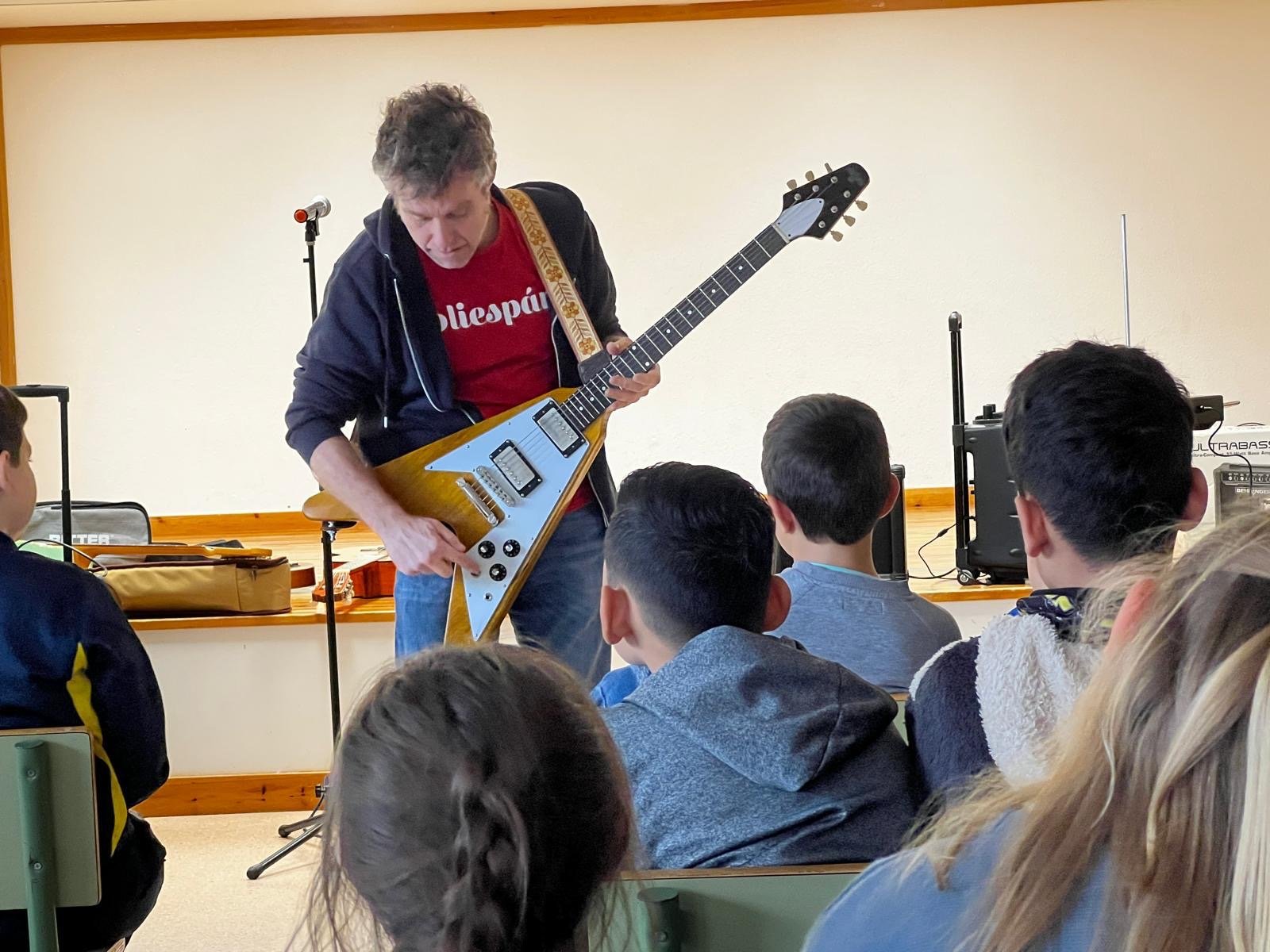El ecuador de la semana transformó el colegio en un gran festival en vivo. Gracias a la generosa colaboración de artistas y entidades locales, las aulas y patios se convirtieron en escenarios improvisados. La diversidad estilística fue la nota dominante, contando con la presencia de Santi de Los Gandules, el grupo Ayud Road, Sarumba Dance y la Asociación Musical Pascual Marquina. Desde los toques marciales de la corneta de la Academia de Logística hasta dinámicas modernas como el karaoke o el «Pasapalabra musical», el alumnado exploró el arte sonoro de forma práctica y divertida.
