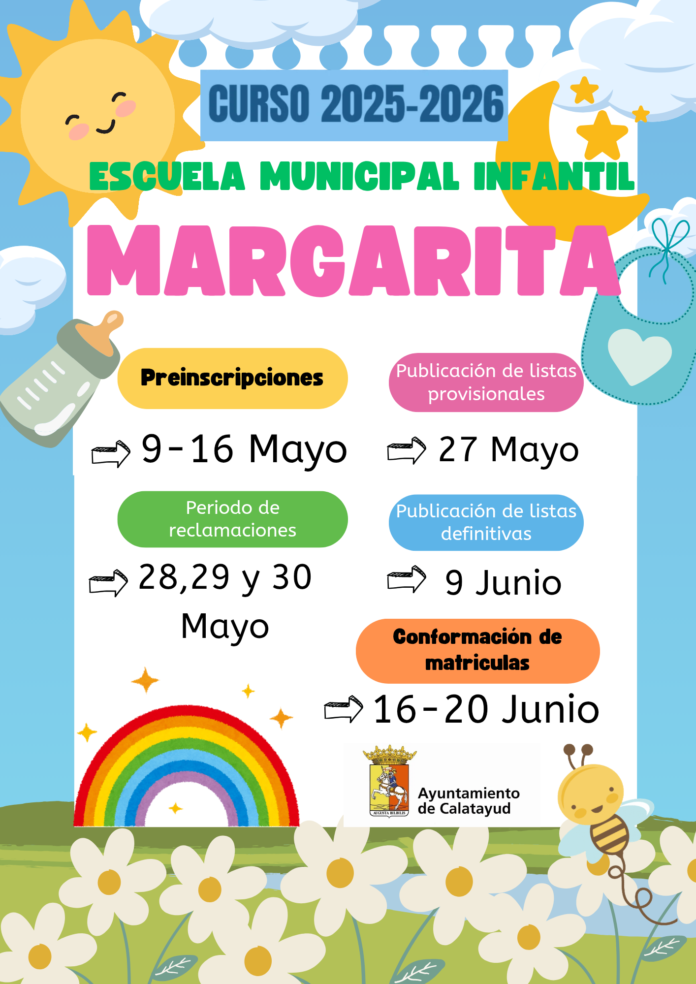 Desde este viernes 9 de mayo y hasta el próximo día 16 se pueden hacer las inscripciones de los pequeños en la Escuela Municipal Infantil de Margarita de Calatayud. Después de los periodos para la publicación de listas provisionales, reclamaciones y listas definitivas, será entre los días 16 y hasta el 20 de junio cuando se realicen las confirmaciones de las matriculas.