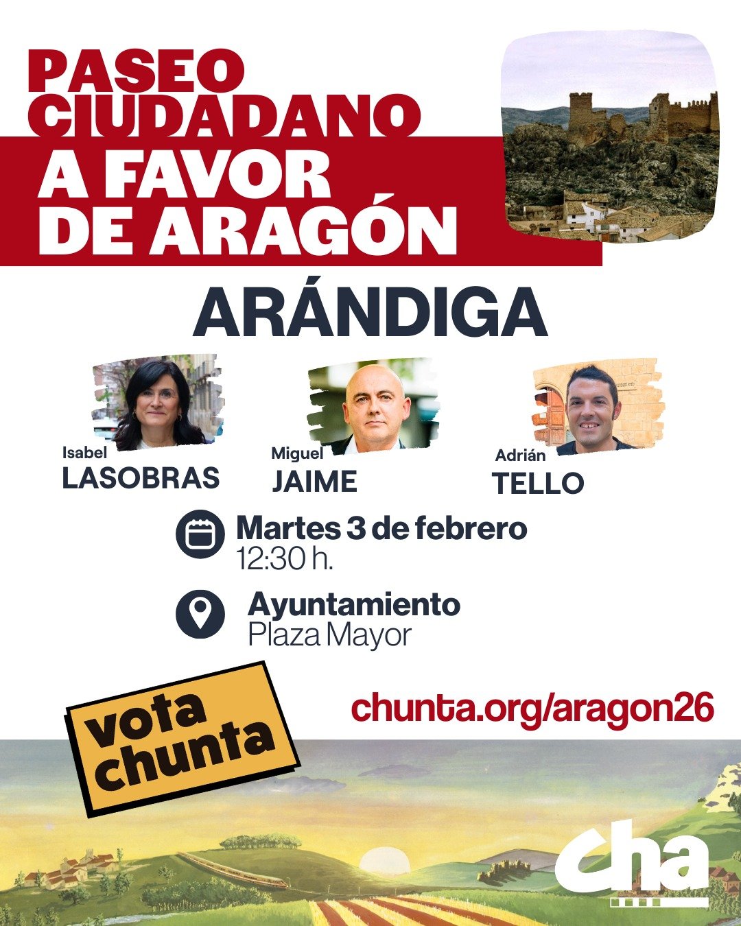 Con esta convocatoria, CHA refuerza su presencia en el territorio aragonés, invitando a la movilización ciudadana y promoviendo su plataforma web enfocada en la campaña de 2026. El acto combina el contacto directo con la realidad rural y la puesta en valor del patrimonio local, simbolizado en la imagen del histórico castillo que preside la villa.
