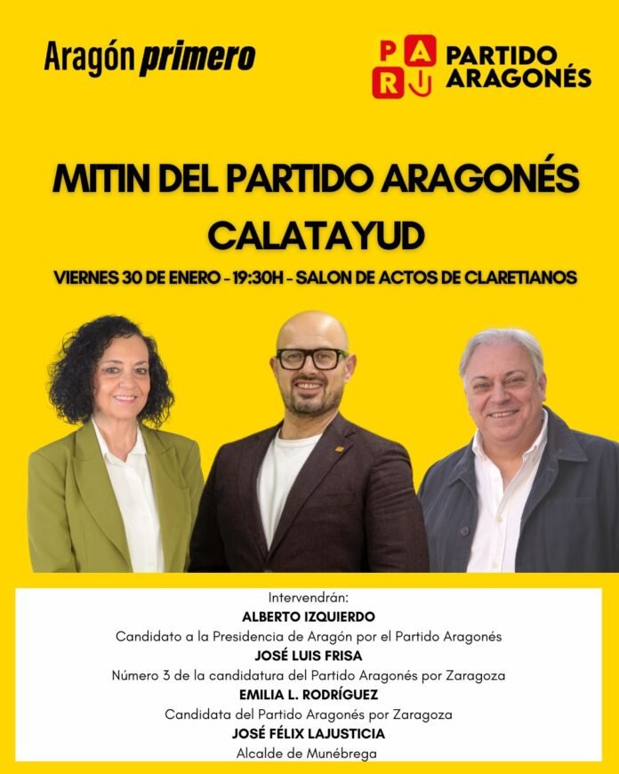 El Partido Aragonés (PAR) intensifica su actividad en esta campaña electoral de cara a las elecciones a las Cortes de Aragón del próximo 8 de febrero. Lo hará con la celebración de un mitin este próximo viernes 30 de enero, en Calatayud. El evento, que tendrá lugar a las 19:30 horas en el Salón de Actos de Claretianos, se presenta como una cita estratégica para la formación regionalista bajo el lema «Aragón primero», buscando consolidar su apoyo en la provincia de Zaragoza a pocos días de que los ciudadanos acudan a las urnas.