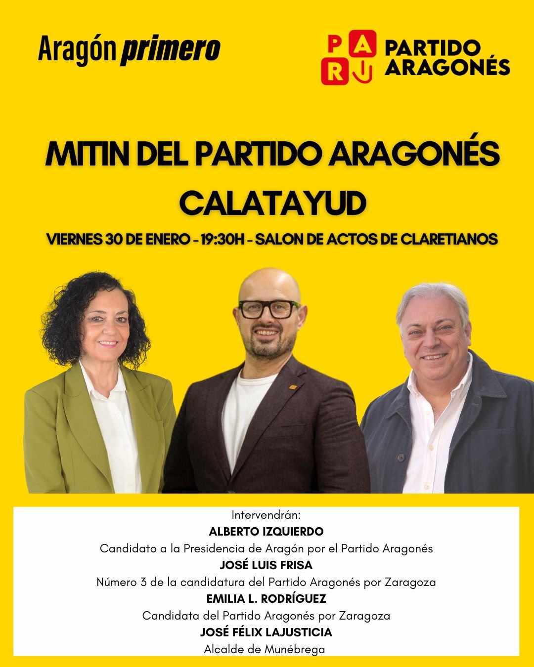 El acto contará con la intervención principal de Alberto Izquierdo, candidato a la Presidencia de Aragón, quien lidera la apuesta del partido por recuperar un papel determinante en las Cortes autonómicas. Izquierdo estará acompañado por figuras de la lista por Zaragoza, como los bilbilitanos José Luis Frisa, número 3 de la candidatura, y Emilia Rodríguez. Asimismo, participará José Félix Lajusticia, actual alcalde de Munébrega y vicepresidente de comarca Comunidad de Calatayud.