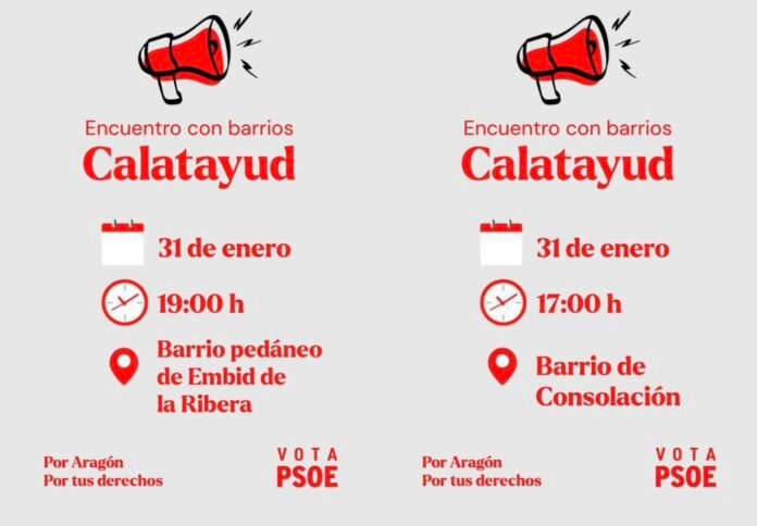 En el marco de la carrera electoral para las próximas elecciones a las Cortes de Aragón, el PSOE de Calatayud ha programado para hoy sábado, 31 de enero, una serie de encuentros de proximidad bajo el lema «Encuentro con barrios». Estas citas forman parte de la estrategia socialista para movilizar el voto en la recta final de la campaña, buscando el contacto directo con los vecinos de los núcleos rurales y los barrios de la ciudad.
