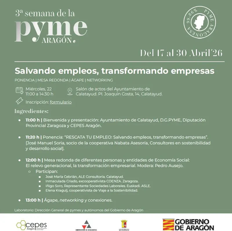 La programación comenzará a las 11:00 horas con una bienvenida institucional a cargo de representantes del Ayuntamiento de Calatayud, la Dirección General de Pymes, la Diputación Provincial de Zaragoza y CEPES Aragón. Seguidamente, José Manuel Soria, socio de la cooperativa Nabata Asesoría y consultor en sostenibilidad y desarrollo social, ofrecerá la ponencia central titulada “RESCATA TU EMPLEO”, donde profundizará en los procesos de transformación empresarial.