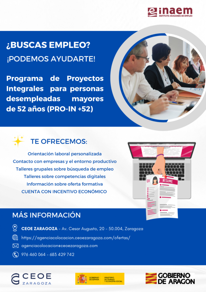 PRO+ IN+ 52 se llama este programa de apoyo que funciona en colaboración con el INAEM y por el cual se atiende la necesidad de trabajadores en Zaragoza y en Calatayud. Va dirigido a quienes tienen ganas de encontrar un empleo, a los que se prepara con una formación que les capacita para su contratación.